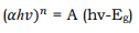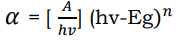 Where A is proportionality constant, h is the Planck’s constant, ν is the frequency of vibration, hν is the photon energy, α is the absorption coefficient and n is either 2 for direct band transitions or 1/2 for indirect band transitions. The absorption coefficient (α) has been calculated using the relation α = 2.303A/t, where t is thickness of the film and A is optical absorbance of film. The direct band gap energy Eg estimated from a Tauc plot of (αhν)2 versus photon energy hν. The value of photon energy (hν) extrapolated to α = 0 gives an absorption edge which corresponds to a band gap Eg 56.