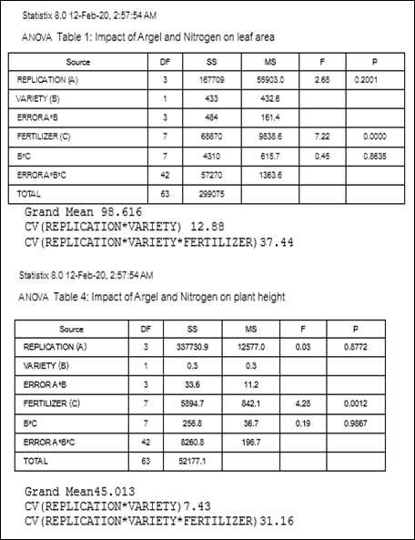 The rates of application of Argel were 0, 140, 240 and 340 Kg/fed., while the treatments of Nitrogen were 0, 25, 50 and 75 kg/fed. All cultural practices such as sowing date; frequent irrigation, thinning, and application of herbicide were timely carried out as recommended by the Research Centre in Sudan. Data pertaining agronomic traitslike Leaf Area (LA), Plant Height (m), Leaf Number (LN), Leaf Area Index (LAI) and Mean Seed Weight were randomly collected. The said data were analyzed by Statistic 8 Software. The results were presented in the form of tables and figures. (Plate 1 and Plate 2)