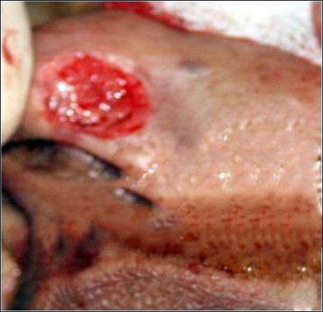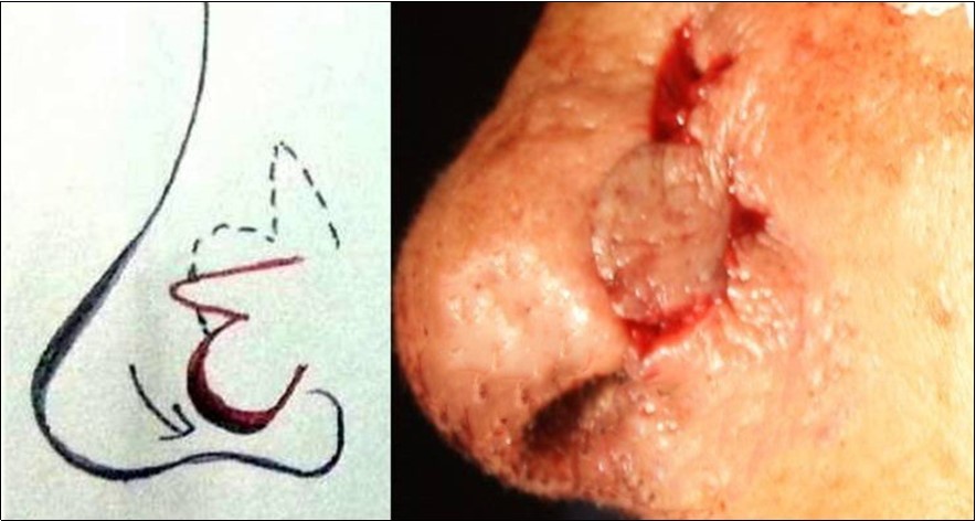 Standard Markings for the bilobed flap design were done and excision of the lesion was carried out 2 mm from the margin of the tumor (Figure 2). The excised lesion was sent for histopathological examination.