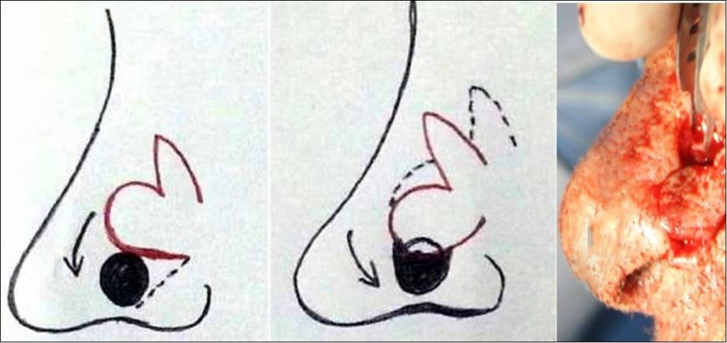 Esser7 was the first person to describe bilobed flap in 1918 as an ideal structure for closing defects in the nasal tip. It was popularised by Zimany8 in 1953 where he published a description of this flap in the English literature. It is a double transposition flap with a single pedicle in which the first flap is transposed into a defect and the second, smaller flap is transposed to fill the secondary defect caused by the larger flap transposition. Thus, the forces of tension are distributed in various directions, and the skin distortions and redundancy generated by a simple transposition flap or by primary closure are reduced. Zitelli9 In 1989, methodized the bilobed flap for the reconstruction of defects in the nasal tip and alar.
