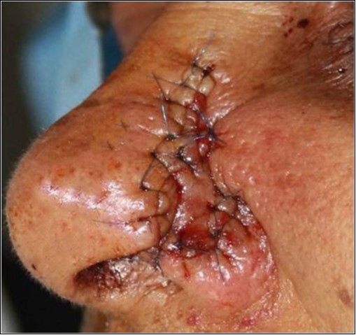 The area surrounding the Ala of nose was infiltrated with 2% lignocaine with 1:200000 adrenaline. The flap was raised based on the size of the defect to be covered, the central lobe of the flap was rotated into the primary defect (Figure 4) and the secondary defect was closed primarily by direct suture (Figure 5). The patient has been followed up for 3 years with no evidence of recurrence.