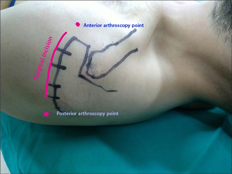 The idea of HLSSM2 is to get the least easy surgical intervention, as arthroscopic surgery begins with examining the shoulder joint, and the location and size of the lesion are determined, then open over the lesion with an open surgical approach that is very limited for surgical repair; not using arthroscopic instruments but conventional surgical instruments in the second step. Figure 1