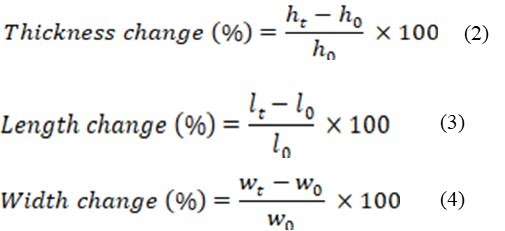 Dimensional measurements were done using digital caliper with an accuracy of 1μm. The changes in thickness, length, and width were calculated based on Eq. (2-4).