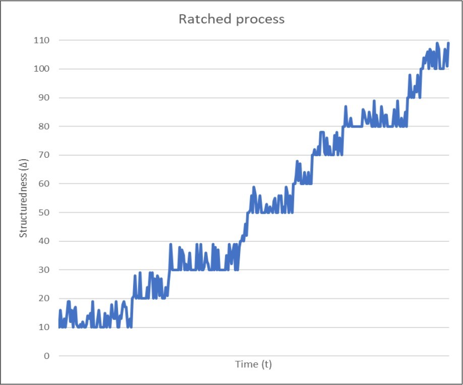 Figure 4 demonstrates the growth of structuredness in a non-equilibrium system as a result of the ratchet process. When such a system arises (t = 0), it has only stable structure that forms it as a system. Accordingly, its structuredness is equal to some relatively small value determined by these stable structural elements. I, quite arbitrarily, set it to 10 in some conventional units.