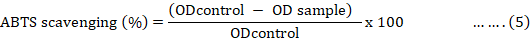 Re’s method was used to estimate the capacity of the extracts to scavenge ABTS radicals (ABTS•+) 22. The ABTS•+ solution was diluted in 0.1 M sodium phosphate buffer (pH 7.4) to provide an absorbance of 0.750 at 734 nm, then 1 mL of the diluted ABTS•+ solution was added to 0.5 mL crude methanol extract. The absorbance was recorded at 1 min after mixing, and the percentage of radical scavenging was relative to a blank that containing no scavengers. The scavenging activity of test compounds was determined using the following equation:
