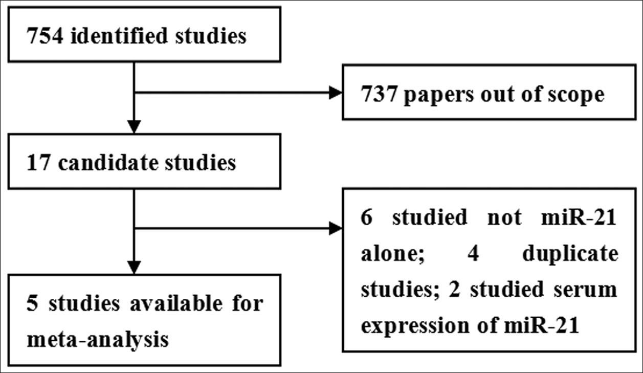 As shown in Figure 1, seven hundred and fifty four records are identified. After review of title and abstracts, seven hundred and thirty seven studies are excluded due to their irrelevance to the current analysis. Furthermore, twelve candidate studies are excluded because of the following reasons: 6 studies without detecting miR-21 alone; 4 duplicate studies; 2 studies focusing on serum expression of miR-21 16, 17. Therefore, the final meta-analysis was performed on the basis of the remaining 5 studies 18, 19, 20, 21, 22. The main features of eligible studies are summarized in Table 1.