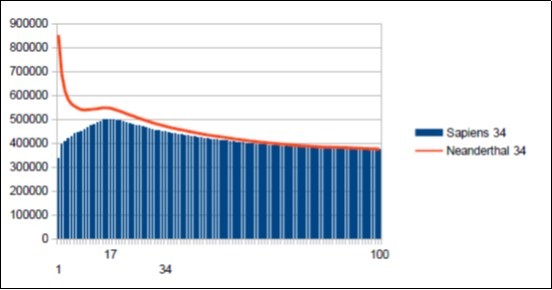 Figure 1.As will be demonstrated here, the 2 respective Chromosomes 4 of Neanderthal and Sapiens HG38 share a "resonance" of 34 bp, however, these two radically different resonance curves illustrate a major differentiation of the 2 human species at the GLOBAL scale of chromosome 4.