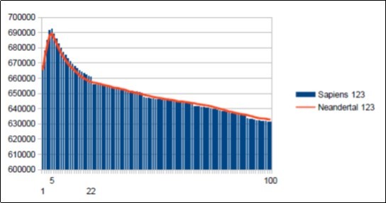 Here is the summary synthesis: By comparing chromosome chromosome the 3 reference genomes of Neanderthal 21, Sapiens BUILD34 of 2003 22 and Sapiens HG38 of 2013 23, we demonstrate the evidence of « fractal periods » and « Resonance periods» characterizing each of the 24 human chromosomes. As illustrated in Figure 1 below, these resonances make it possible to differentiate the respective genomes of Neanderthal and Sapiens on the global scale of the chromosome (here chromosome 4). Here, a resonance of 34 nucleotides is common to both chromosomes 4 of Sapiens and Neanderthal, however, the respective forms of these resonance curves are radically different.