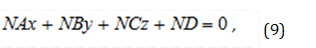 where N is the normalization coefficient, A, B, C, D are the coefficients of the equation of the plane of the triangle, x, y, z are the coordinates of an arbitrary point.