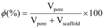 Vporeis calculated as the weight of absorbed solution (PBS) divided by the density of the buffer. The amount of water absorbed in the pores was corrected by the swelling of non-porous chitosan samples. The scaffold’s volume (Vscaffold) was calculated as the ratio of scaffolds weight and experimentally determined density of non-porous chitosan film (ρ = 1.97 g/mL).